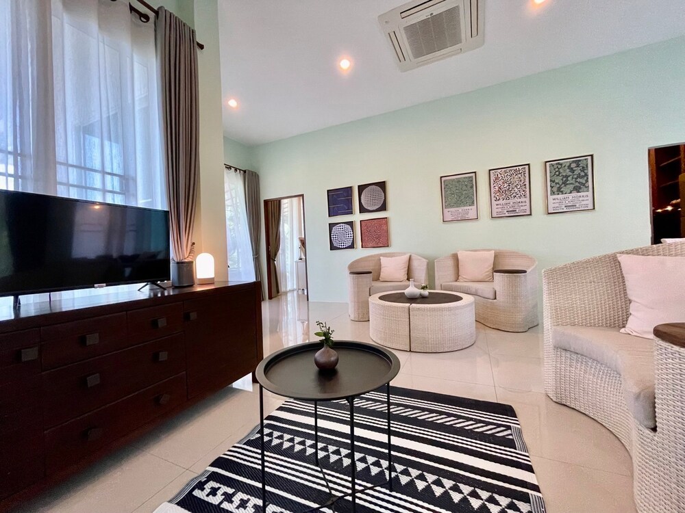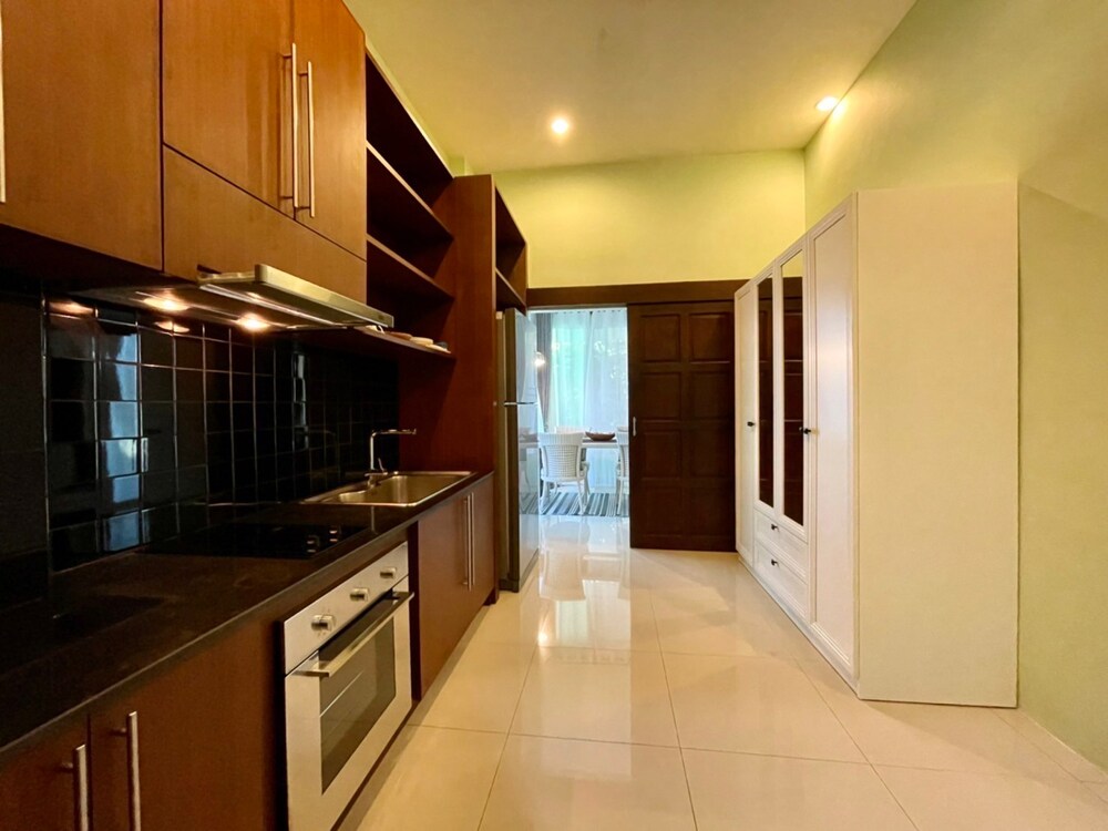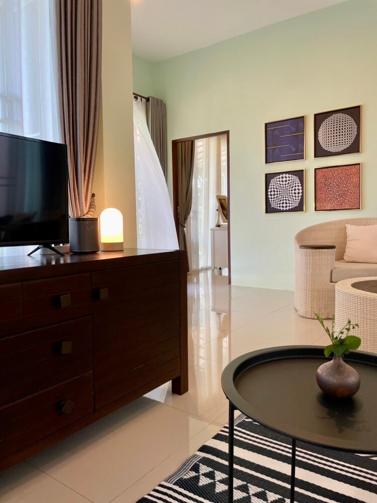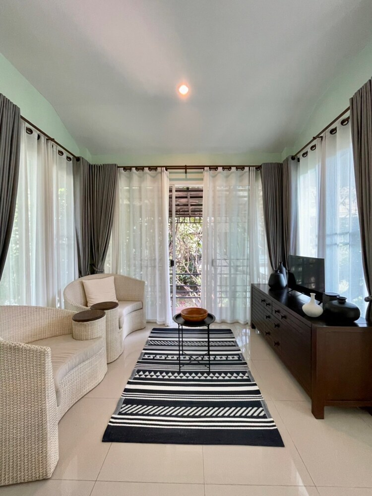 It is a corner room on the 2nd floor, decorated in a modern style, elegant, warm, like being at home, with a balcony, can be arranged as a seating area, drinking coffee, sitting and watching the garden, big trees, shady, large swimming pool. spacious room The bedroom has an ensuite bathroom. Separate dressing room, living room, kitchen and guest bathroom is in perfect proportion Emotions are similar to being at home.