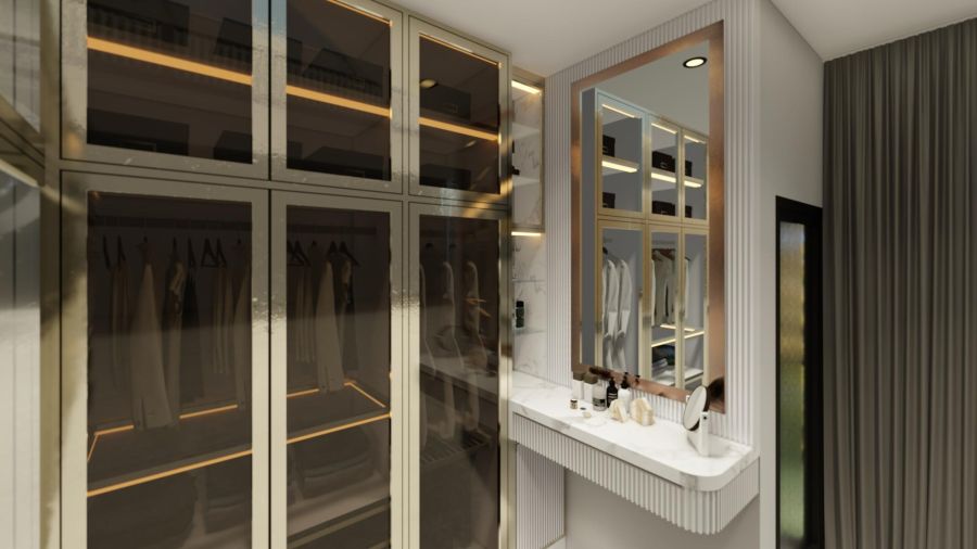 ตู้เสื้อผ้าแบบตัว L 4 ตู้ โซฟาหนังแท้ปรับเอนได้อัตโนมัติ เตียง King Size