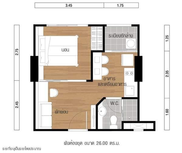 ขนาด 26 ตรม. 1 ห้องนอน 1 ห้องน้ำ