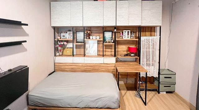 คอนโดสูง 27 ชั้น อยู่ชั้น 9 ตึก A พื้นที่ใช้สอย ประมาณ 34.27 ตารางเมตร ห้อง 1 Bedroom 1 ห้องนอน 1 ห้องนั่งเล่น 1 ห้องน้ำ 1 ห้องครัว และพื้นที่ระเบียง