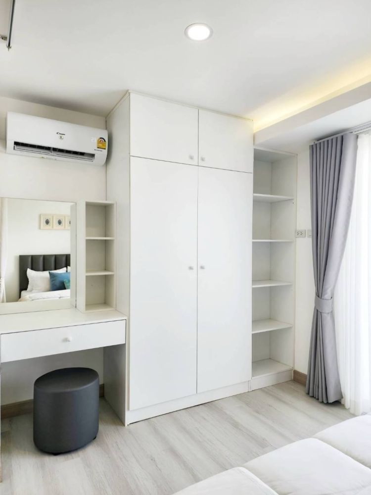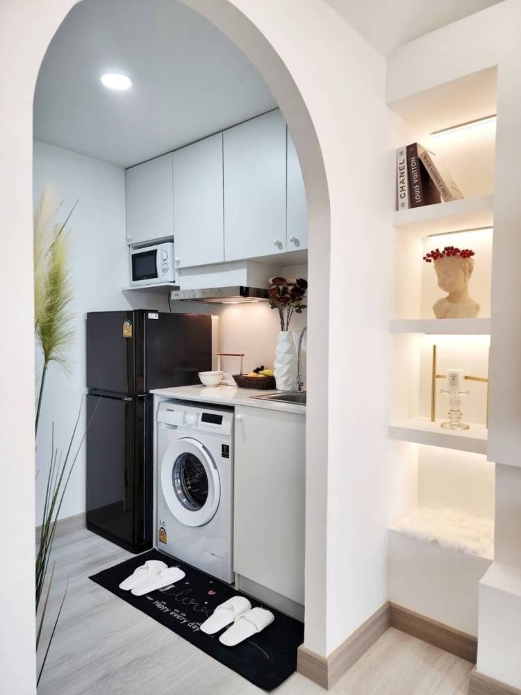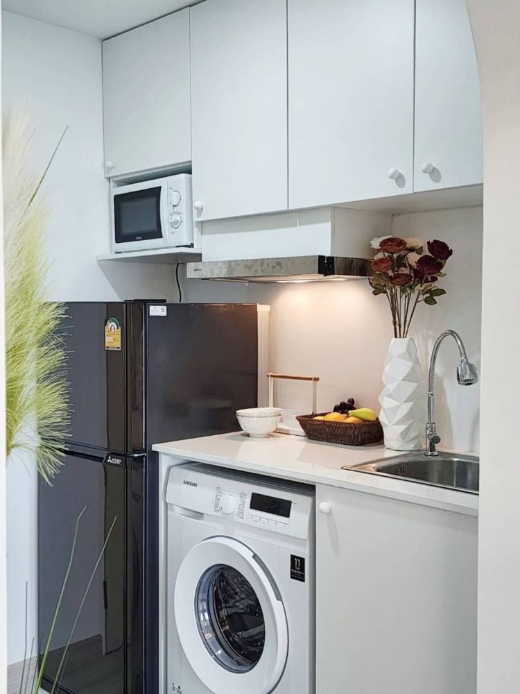 ฮู้ดดูดควัน เตาไฟฟ้า เครื่องซักผ้า เครื่องทำน้ำอุ่น พร้อมเรนชาวเวอร์ ม่านล่อน 2 ชั้น โต๊ะข้างเตียงอัจฉริยะ
