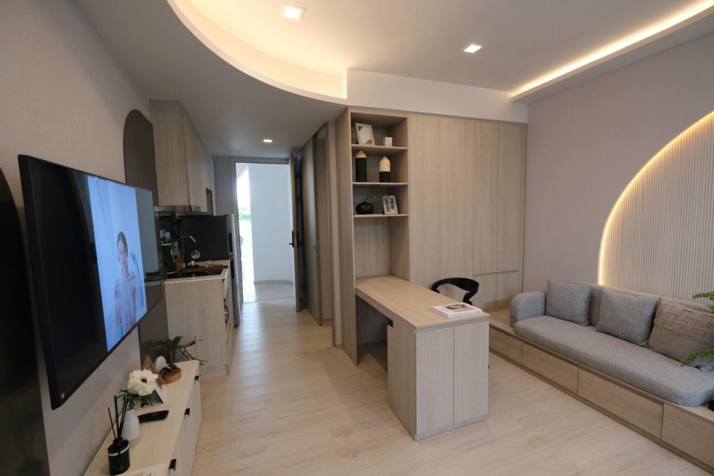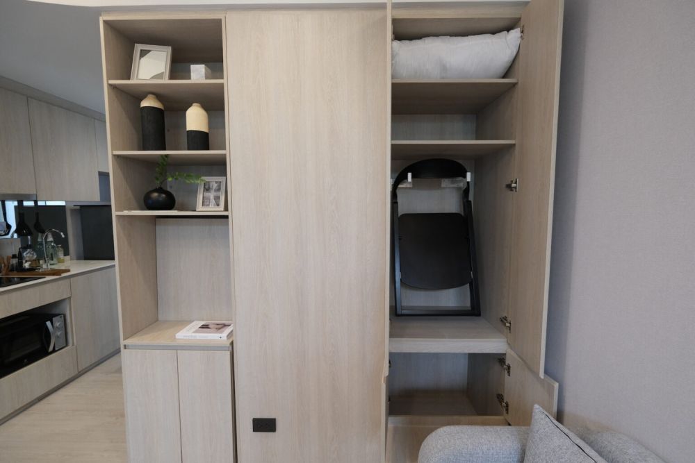 living space เป็น built-inโต๊ะกินข้าว แบบพับเก็บเข้าไปในตู้ได้ เพื่อเพิ่มพื้นที่ใช้สอย