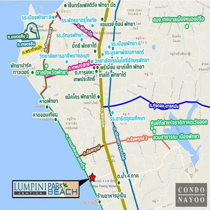 การเดินทาง เริ่มจาก ถนนสุขุมวิท มุ่งหน้าทางใต้ ไปตามถนนหมายเลข 3 (ทางแยก ถนนพัทยาใต้) ⇒ เลี้ยวขวาเข้าสู่ ถนนชัยพฤกษ์ ⇒ เลี้ยวซ้ายเข้าสู่ ถนนจอมเทียนสายหนึ่ง ⇒ คอนโด ลุมพินี พาร์คบีช จอมเทียน เฟส 1 *โครงการอยู่ระหว่าง ซอยจอมเทียน 18 – 19