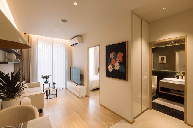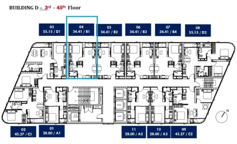 Unit No. SKV64-D-4404 อาคาร D ชั้น 44 วิวสวย 1 ห้องนอน ขนาด 34.41 ตร.ม. ระเบียงหันไปทางฝั่งแม่น้ำ