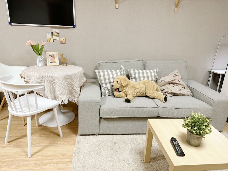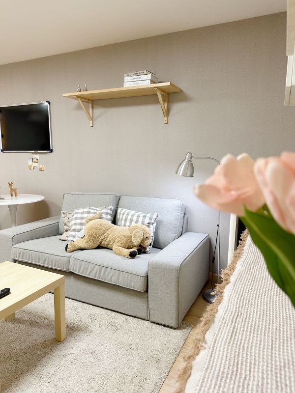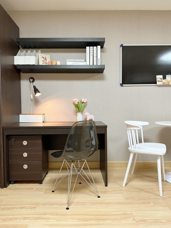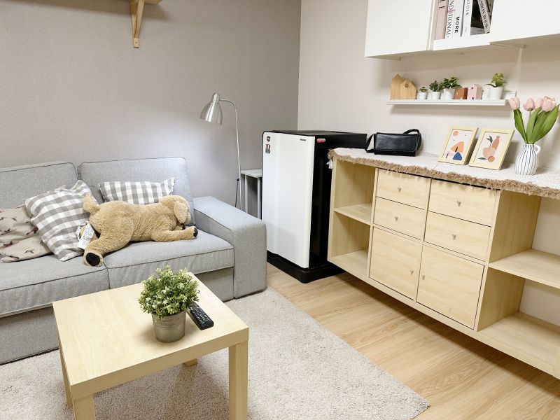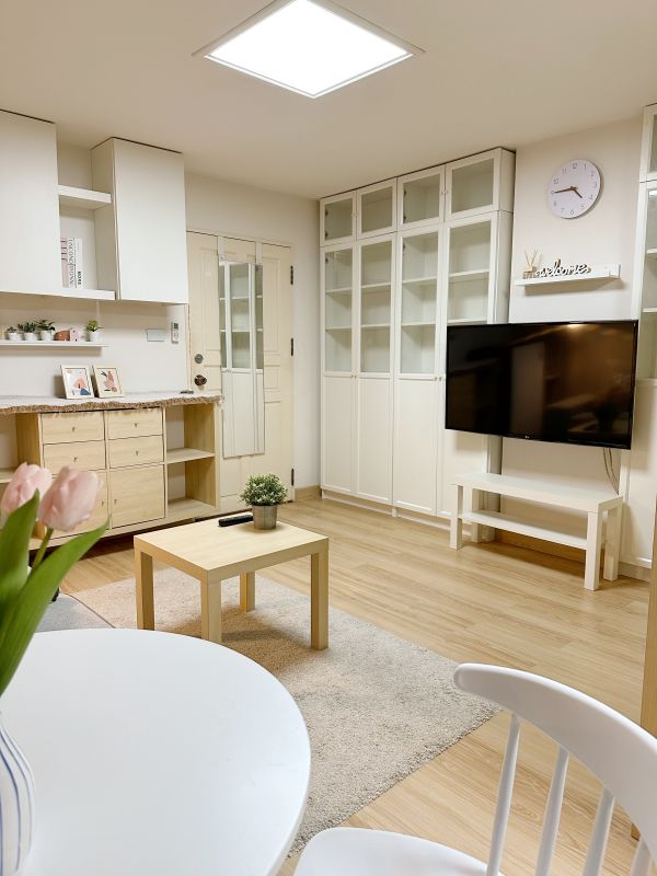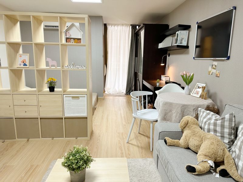 ห้องตกแต่งสไตล์อบอุ่น มีพื้นที่นั่งดูทีวี มุมทานอาหารแบบ 2 ที่นั่งพื้นที่โต๊ะอ่านหนังสือและตู้เสื้อผ้าสำเร็จรูปรูปแบบห้องสตูดิโอ