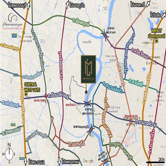 - เส้นทางที่ 2 : ขึ้นสะพานพระนั่งเกล้า2 (ป้ายบางบัวทอง) ผ่านสถานีไทรม้า และเข้าสู่ ซ.ไทรม้า7 ก็จะเจอโครงการ Metro Luxe Riverfront อยู่ด้านขวามือ