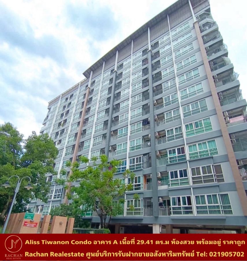ขายด่วน Aliss Tiwanon Condo อาคาร A ชั้น 5 เนื้อที่ 29.41 ตารางเมตร แบบห้อง Studio 1 ห้องนอน 1 ห้องน้ำ 1 ห้องครัว แอร์ 1 เครื่อง ค่าส่วนกลาง 900 บาท/เดือน พร้อมระเบียง หน้าระเบียงหันทิศเหนือ ห้องแต่งสวยพร้อมอยู่ ราคาถูกต่อรองได้ยินดีจัดสินเชื่อให้ฟรี