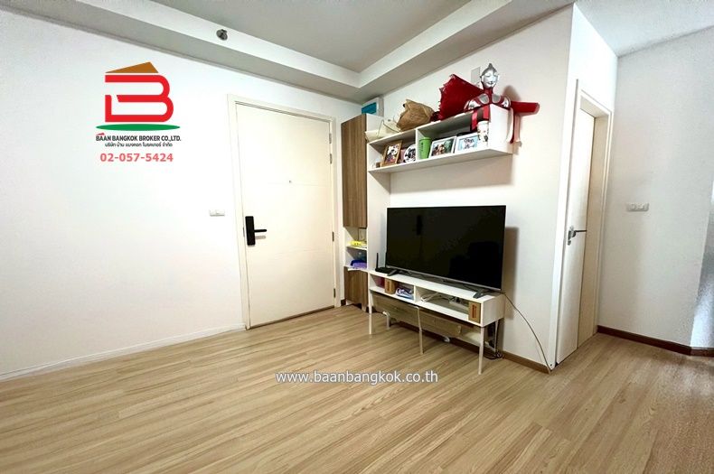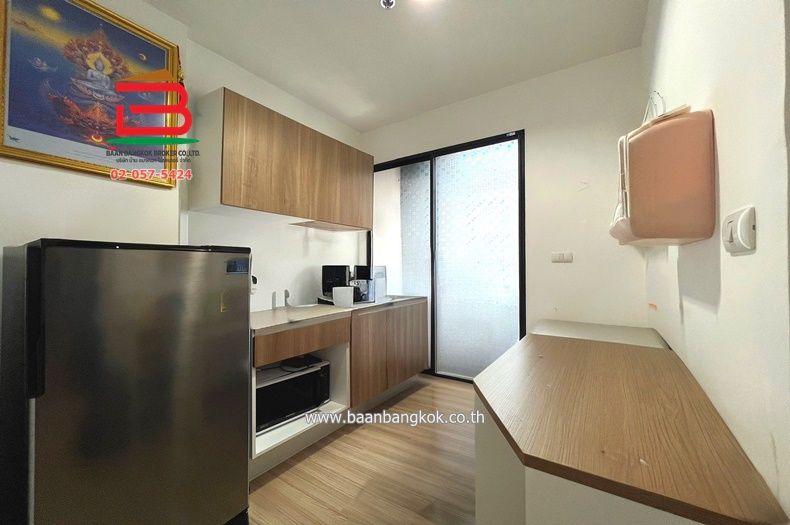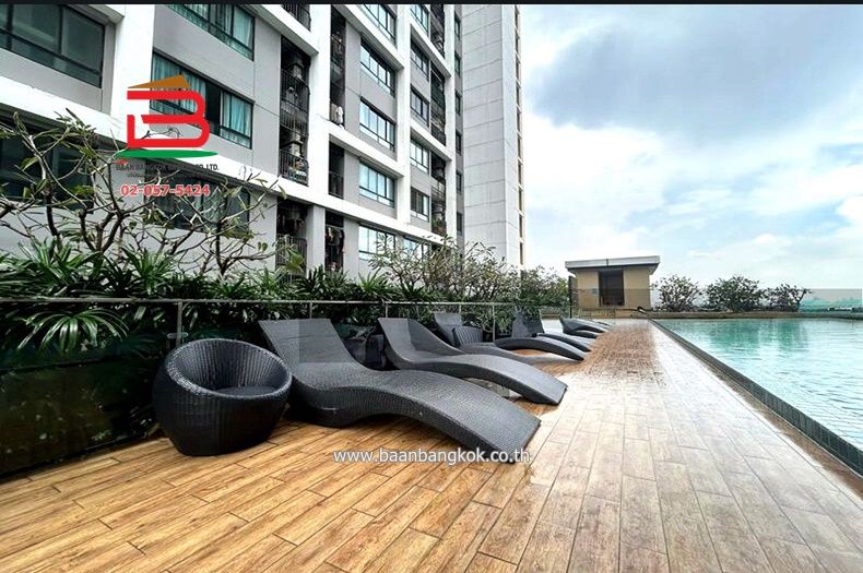 การตกแต่ง : ภายในห้องปูพื้นลามิเนต มีระเบียงเห็นวิวสระว่ายน้ำของโครงการ และมีโซนห้องครัวที่สนาม