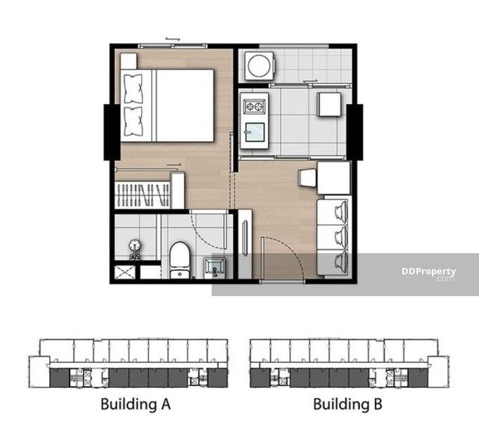ขนาด 25.54 ตรม. 1 ห้องนอน มีห้องนั่งเล่น ห้องนอนกั้นแยก