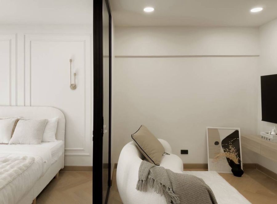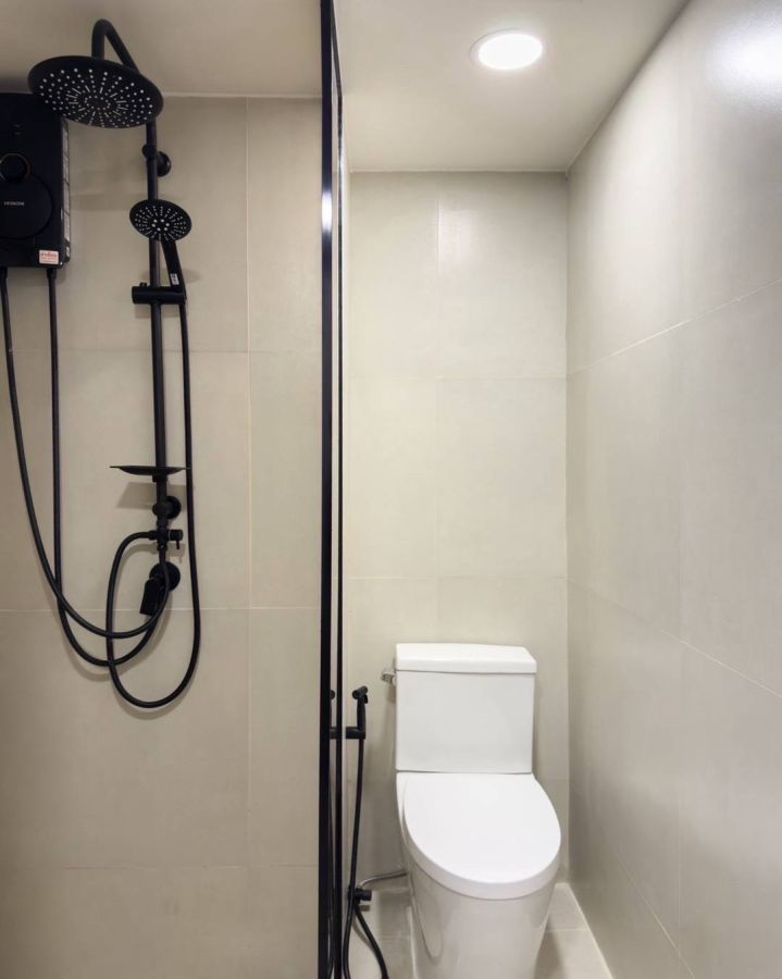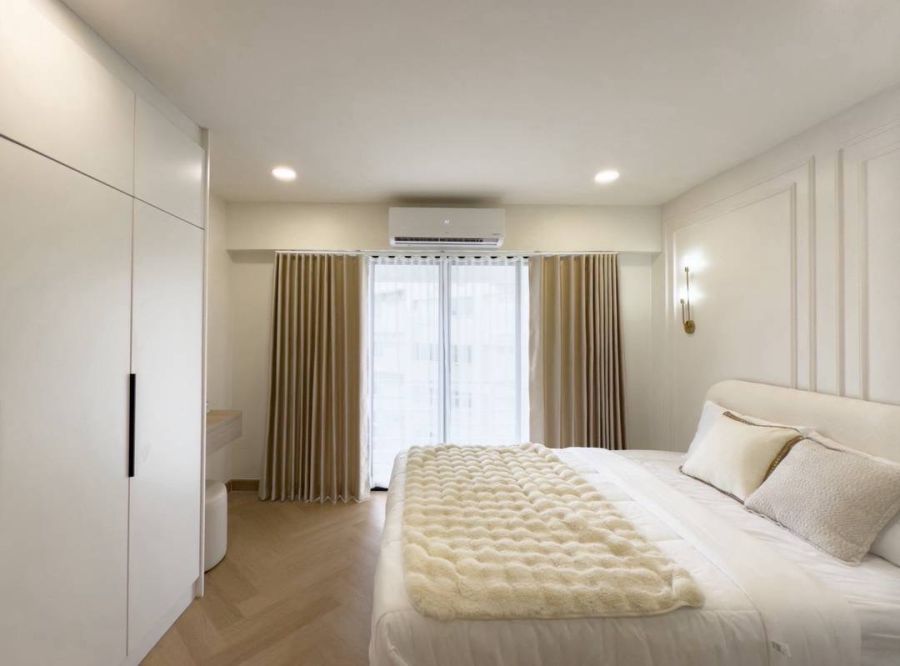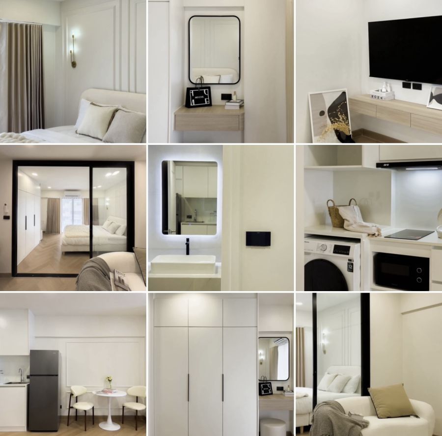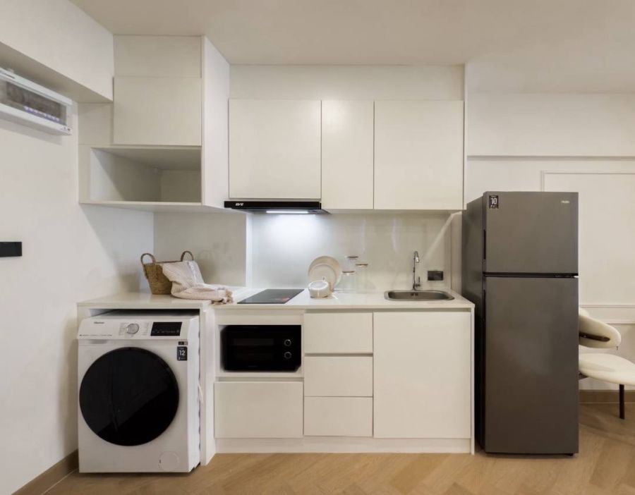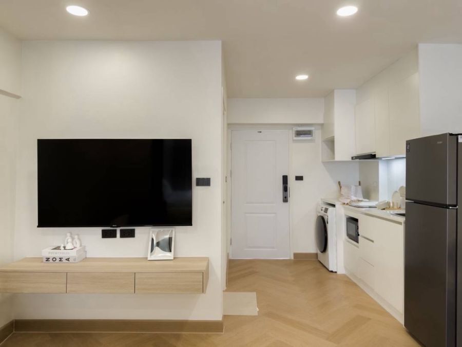 เตียงนอน, โต๊ะเครื่องแป้ง, ตู้เสื้อผ้า, ทีวี, เครื่องซักผ้าพร้อมอบ, เครื่องทำน้ำอุ่น, ไมโครเวฟ, เตาไฟฟ้าพร้อมฮูด, แอร์ 1 ตัว, ตู้เย็น, เครื่องกรองน้ำ
