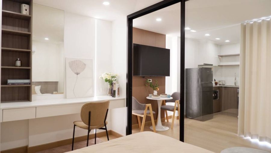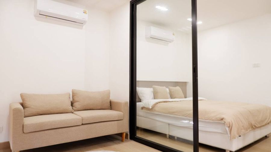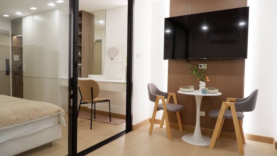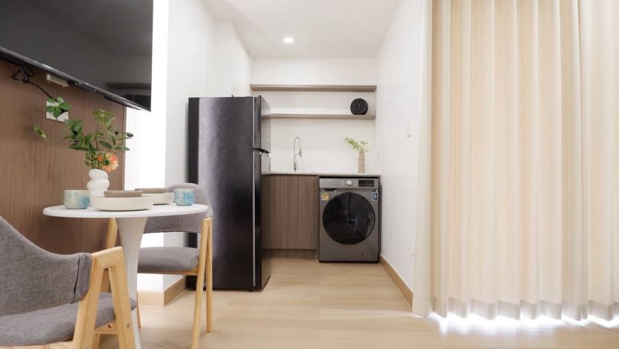 เตียงนอน, โต๊ะเครื่องแป้ง, ตู้เสื้อผ้า, ทีวี, เครื่องซักผ้า, เครื่องทำน้ำอุ่น, ไมโครเวฟ, เตาไฟฟ้าพร้อมฮูด, แอร์ 2 ตัว, ตู้เย็น