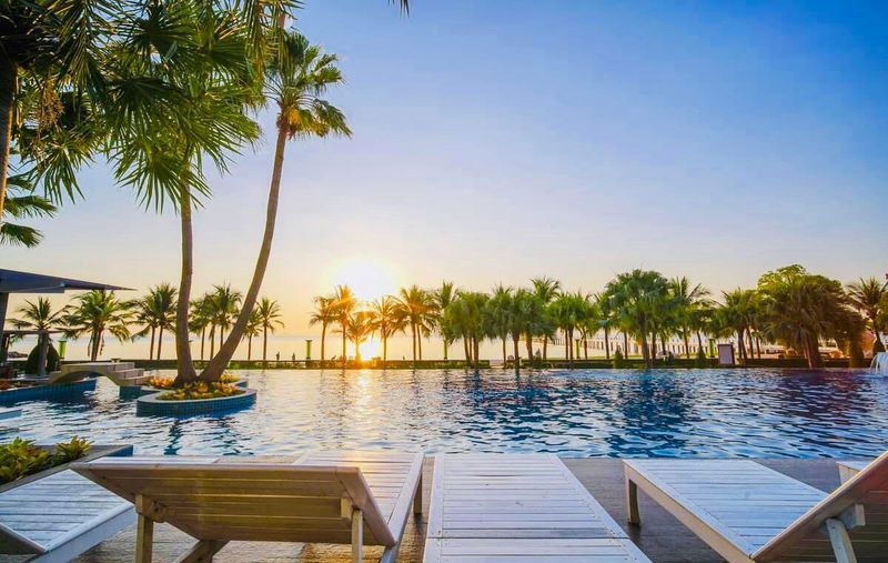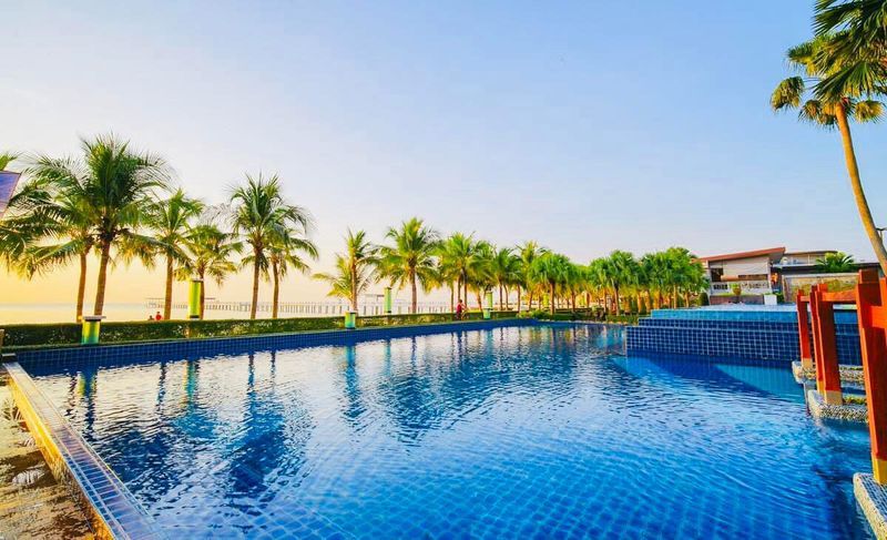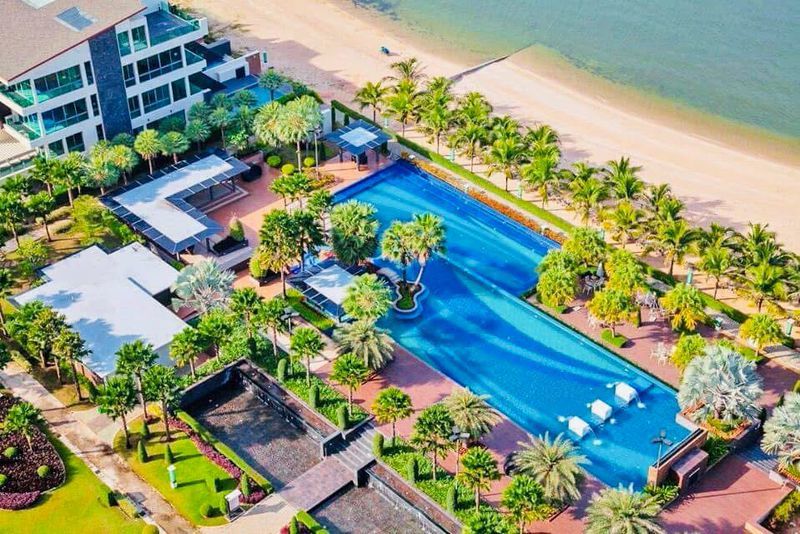 เดินทะลุไปสระว่ายน้ำส่วนกลางขนาดใหญ่ 4 สระ เดินลงทะเลได้เลย คอนโดติดทะเลบนชายหาดส่วนตัวที่เดียวในบางพระ