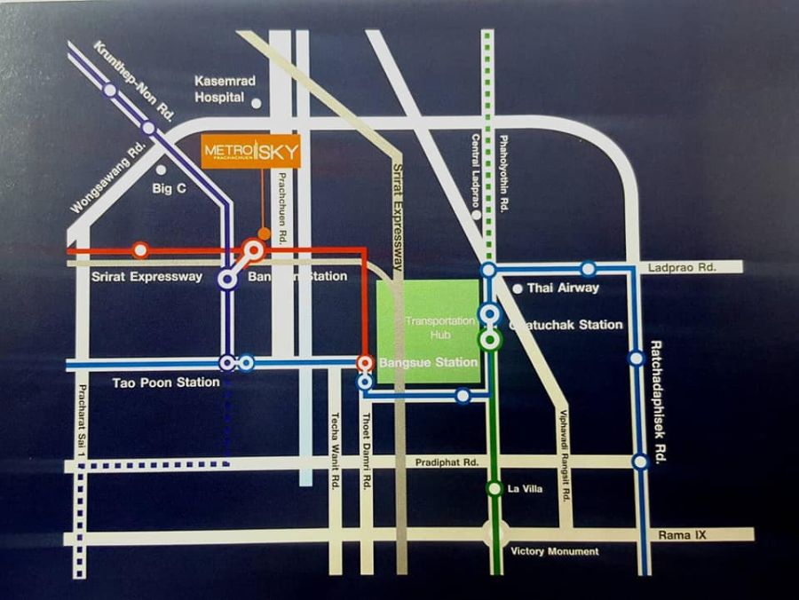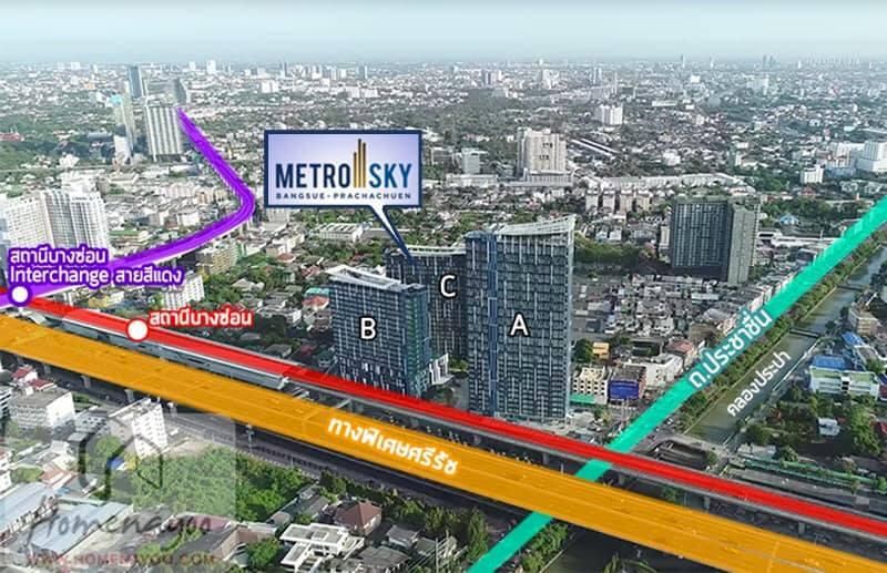 - Metro Sky ประชาชื่น ติดกับรถไฟฟ้าสถานีบางซ่อน รถไฟฟ้าสายสีม่วงและใกล้กับรถไฟฟ้าสายสีแดงอ่อน