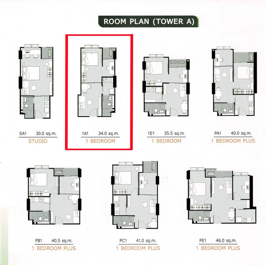 ห้องขนาด 34 ตร.ม. 1 ห้องนอน 1 ห้องน้ำ