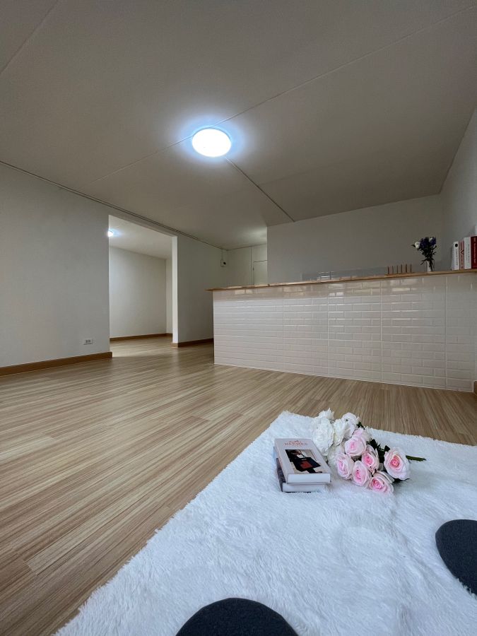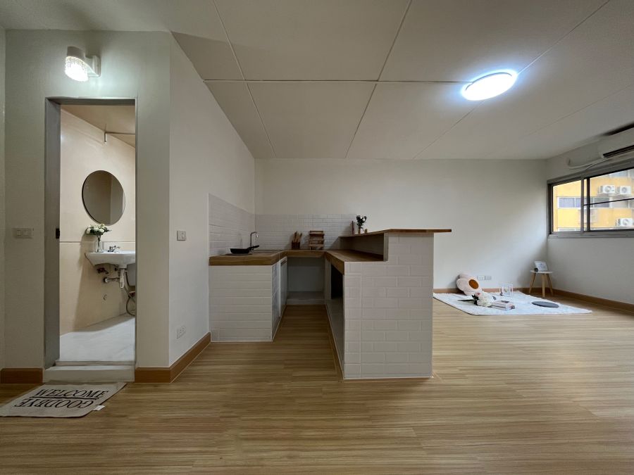 ⏩ ภายในห้อง ตกแต่งพื้นด้วยลามิเนต โดยเลือกเป็นสีไม้เพื่อให้ความรู้สึกอบอุ่นและเพิ่มความมินิมอล แบ่งห้องนอนออกเป็นสัดส่วน ห้องน้ำตกแต่งปูกระเบื้องใหม่สวยงาม และ Built-in เค้าเตอร์ห้องครัวขนาดพอเหมาะพร้อมใช้งาน