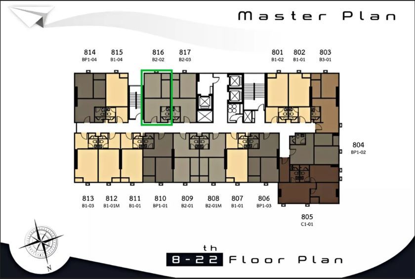 ขนาด 1 ห้องนอน 30 ตารางเมตร ชั้น 12A ตำแหน่ง 12A16 ระเบียงทิศใต้