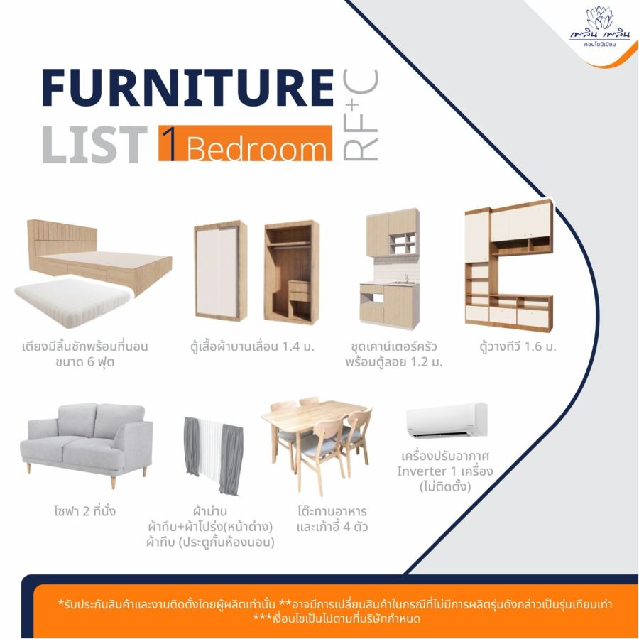 - ขนาด 32 ตร.ม. ชั้น 8 มี 1 ห้องนอน 1 ห้องน้ำ พร้อมเฟอร์นิเจอร์ครบชุด(เตียงมีลิ้นชักพร้อมที่นอน, ตู้เสื้อผ้าบานเลื่อน, ชุดเคาน์เตอร์ครัวพร้อมตู้ลอย, ตู้วาง TV, ผ้าม่าน, โซฟา 2 ที่นั่ง, โต๊ะทานอาหารและเก้าอี้ 4 ตัว, เครื่องปรับอากาศ Inverter 1 เครื่องไม่รวมติดตั้ง)