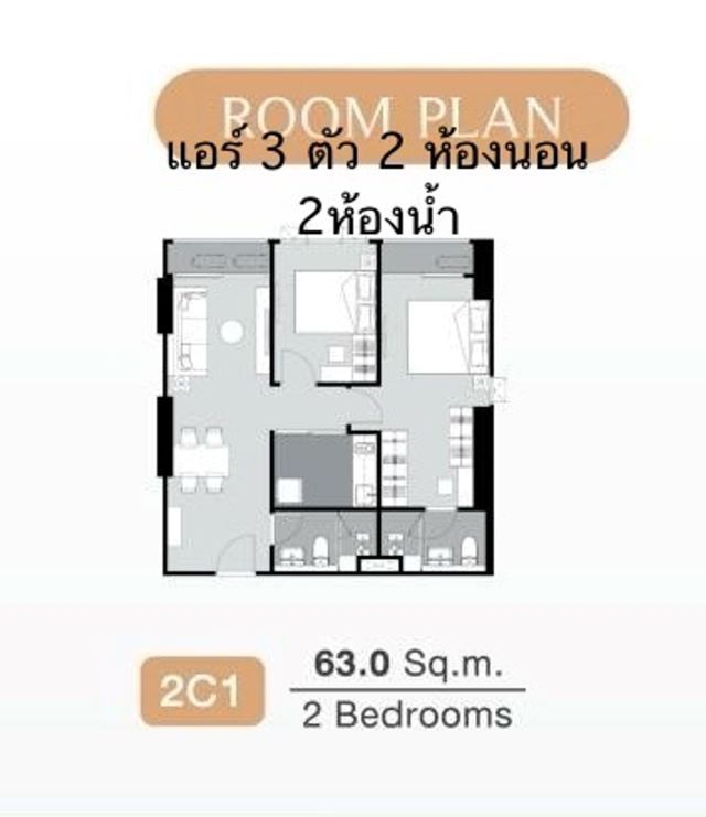-2 ห้องนอน 2 ห้องน้ำ มีห้องน้ำ ในตัวแยกจาก โซนรับแขก ขนาด 63 ตารางเมตร ห้องมุม