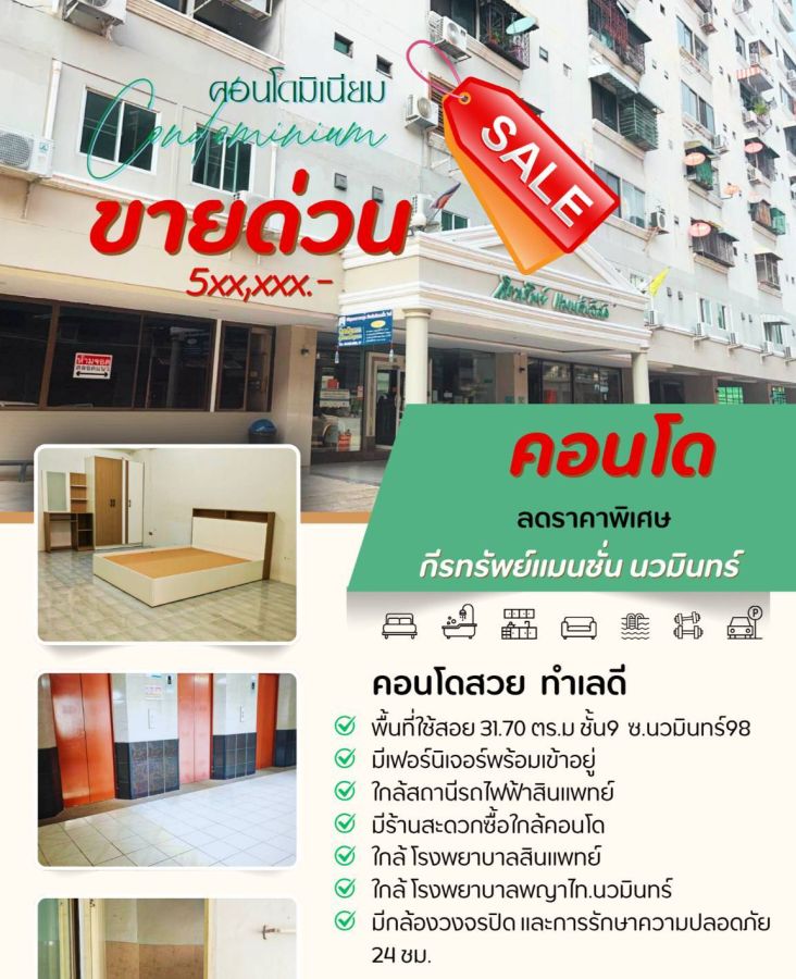 ขายคอนโด กีรทรัพย์ แมนชั่นวิลล์ นวมินทร์ 98 ชั้น 9 เฟอร์ฯครบ พร้อมเข้าอยู่ ทำเลดีใกล้รถไฟฟ้าสินแพทย์