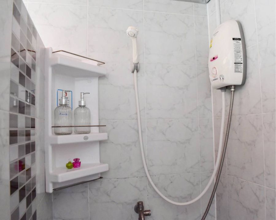 ห้องกว้าง ปูกระเบื้องทั้งห้อง จัดโซนแยกเป็นสัดส่วน