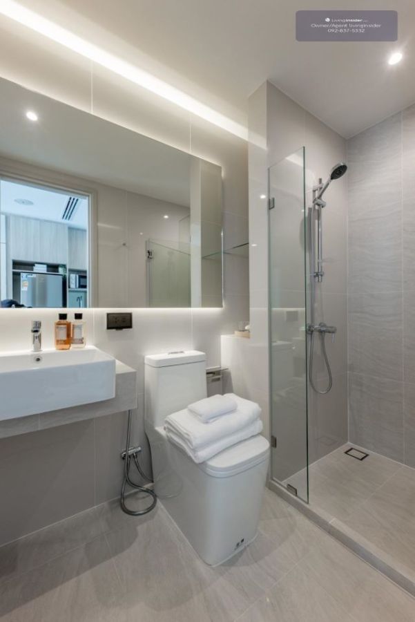 **อุปกรณ์ห้องน้ำครบ ผ้าเช็ดตัว, ชั้นวาง, กระจก ฯลฯ