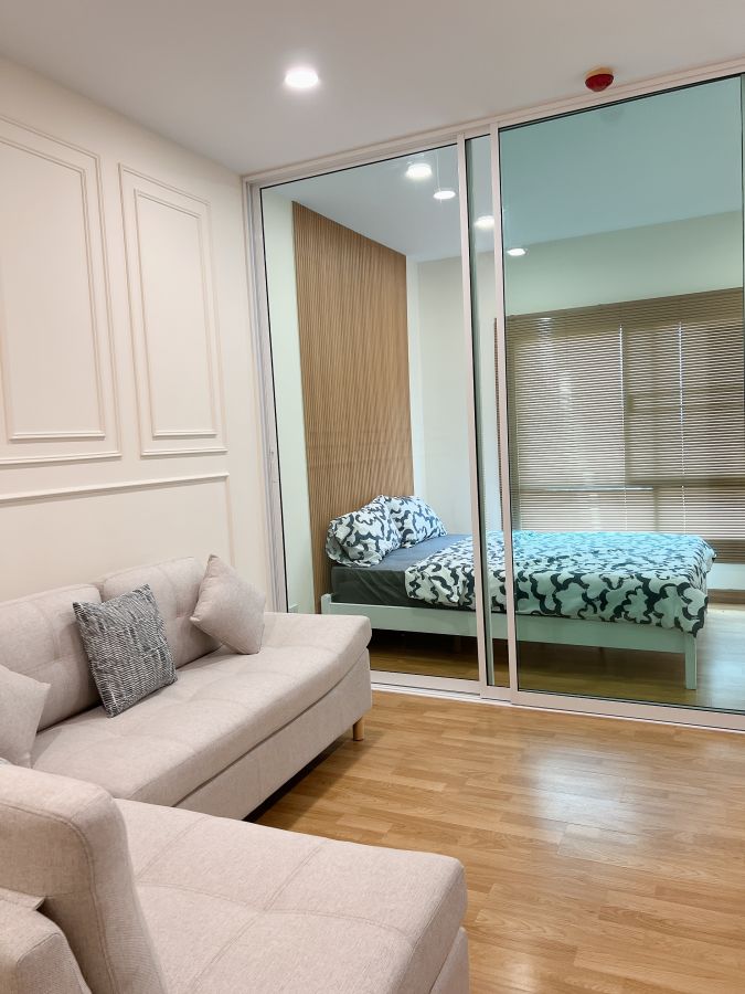 - กั้นห้องจากกระจกเลื่อนระหว่างห้องนอนและห้องนั่งเล่น