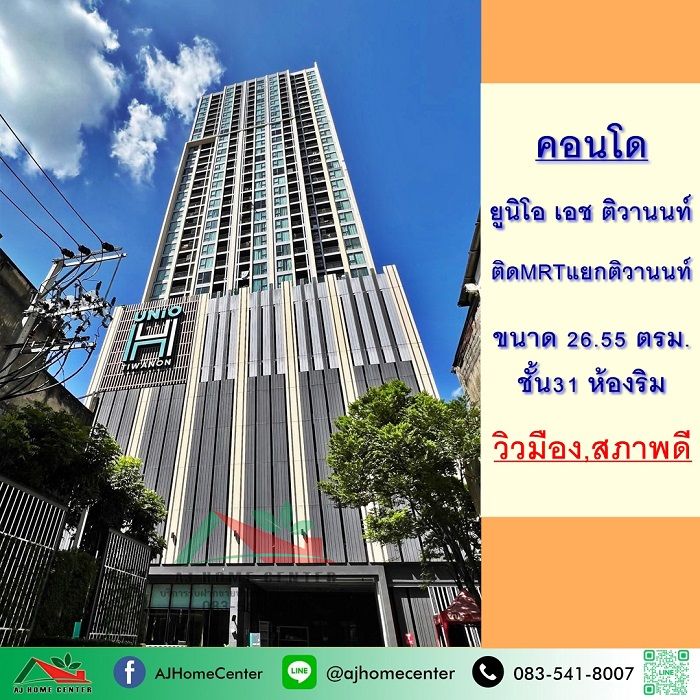 ขายคอนโด ยูนิโอ เอช ติวานนท์ 26.55ตรม. ชั้น31 ห้องริม สภาพดีพร้อมอยู่ ติดรถไฟฟ้า