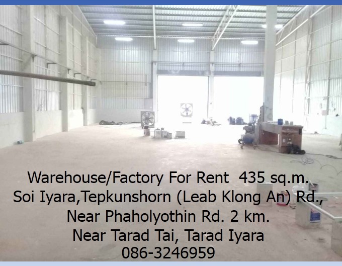 Warehouse/Factory For Rent Soi Iyara,Tepkunshorn (Leab Klong An) Rd., 435 sq.m. Near Phaholyothin Rd. 2 km. Near Tarad Tai, Tarad Iyara