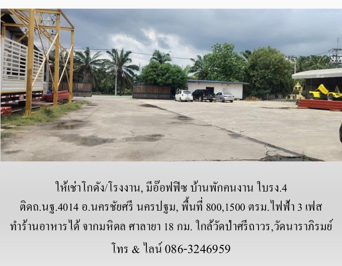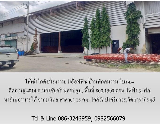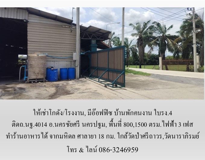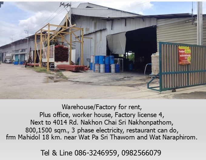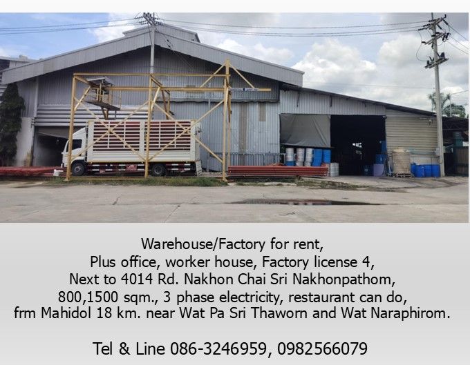 Warehouse/Factory for rent, office, worker house, Factory license 4, 4014 Rd. Nakhon Chai Sri Nakhonpathom,800,1500 sqm., 3 phase electricity, restaurant can do, frm Mahidol 18 km. near Wat Pa Sri Thaworn and Wat Naraphirom.
