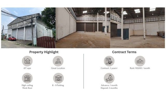 - เพดานสูง เหมาะสำหรับธุรกิจที่ต้องการพื้นที่โปร่งหรือเพิ่มชั้นลอย