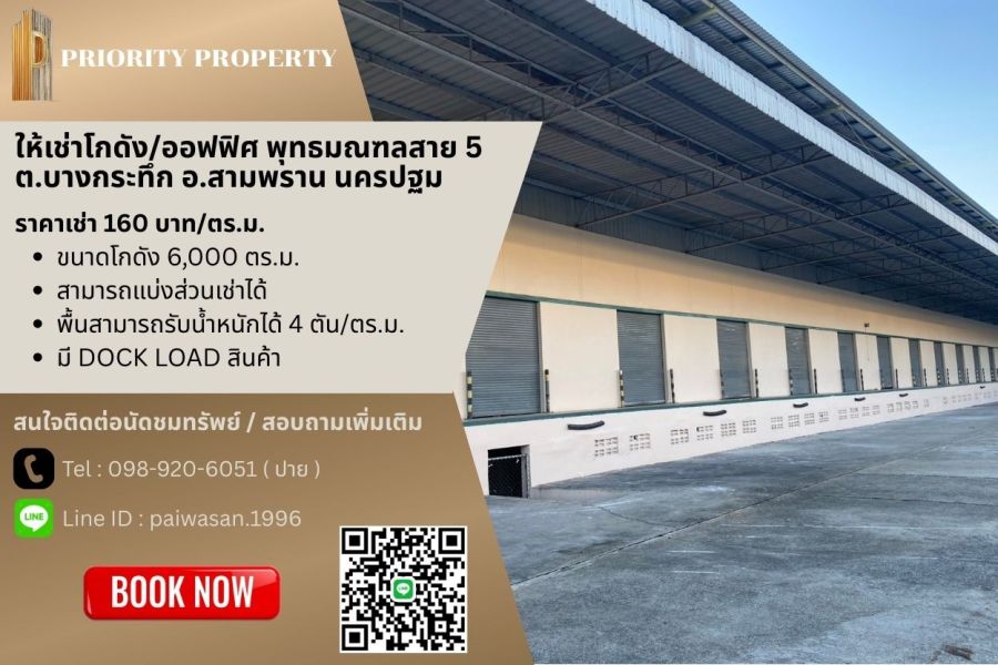 ให้เช่าโกดัง/ออฟฟิศ พุทธมณฑลสาย 5 ต.บางกระทึก อ.สามพราน นครปฐม พื้นที่ 6,000 ตร.ม.