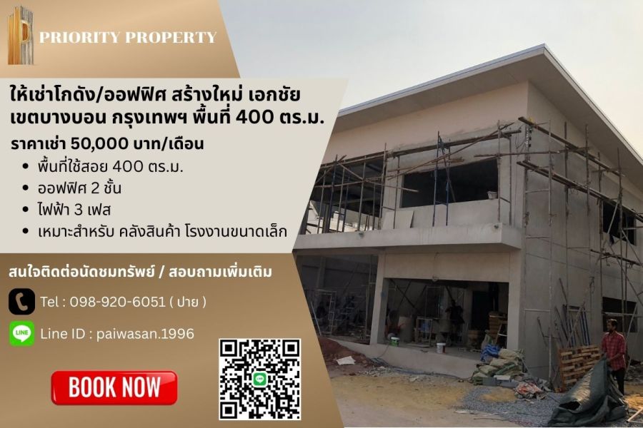 ให้เช่าโกดัง/ออฟฟิศ เอกชัย แขวงคลองบางบอน เขตบางบอน กรุงเทพฯ พื้นที่ 400 ตร.ม.