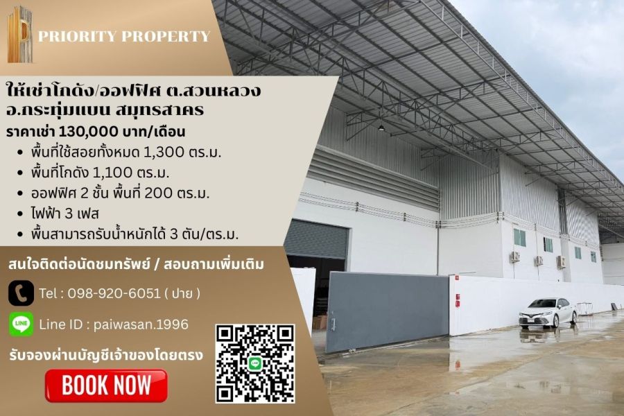 ให้เช่าโกดัง/ออฟฟิศ ต.สวนหลวง อ.กระทุ่มแบน สมุทรสาคร พื้นที่ 1,300 ตร.ม.