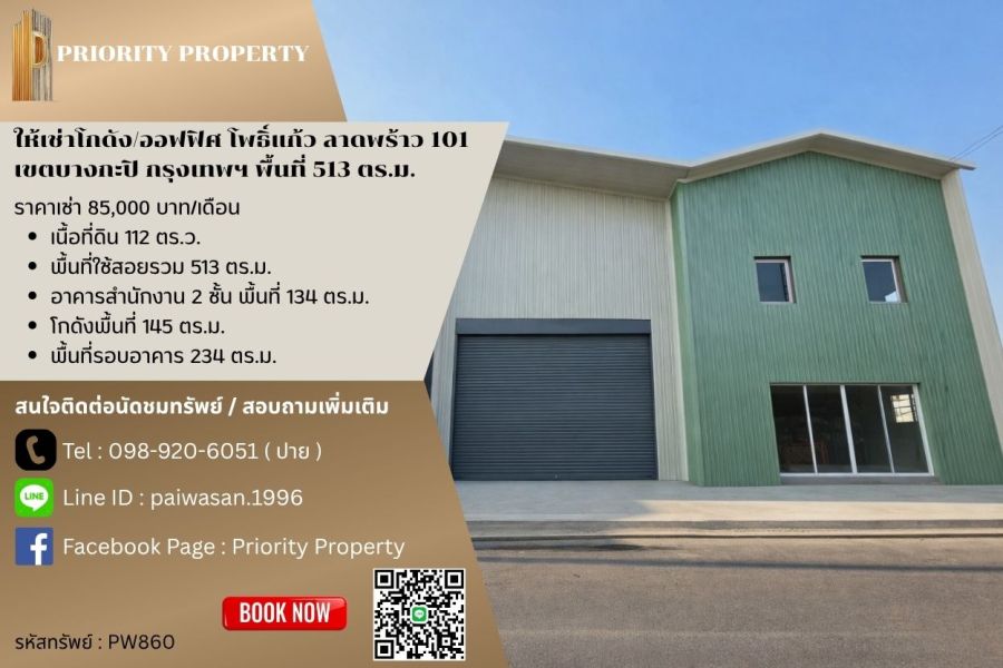 ให้เช่าโกดัง/ออฟฟิศ โพธิ์แก้ว ลาดพร้าว 101 เขตบางกะปิ กรุงเทพฯ พื้นที่ 513 ตร.ม.