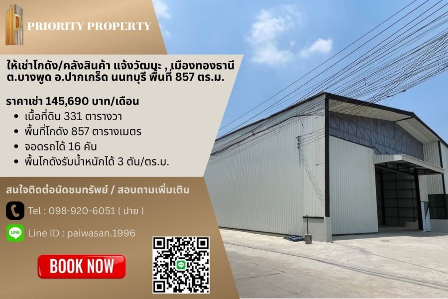 ให้เช่าโกดัง/คลังสินค้า แจ้งวัฒนะ , เมืองทองธานี ต.บางพูด อ.ปากเกร็ด นนทบุรี พื้นที่ 857 ตร.ม.