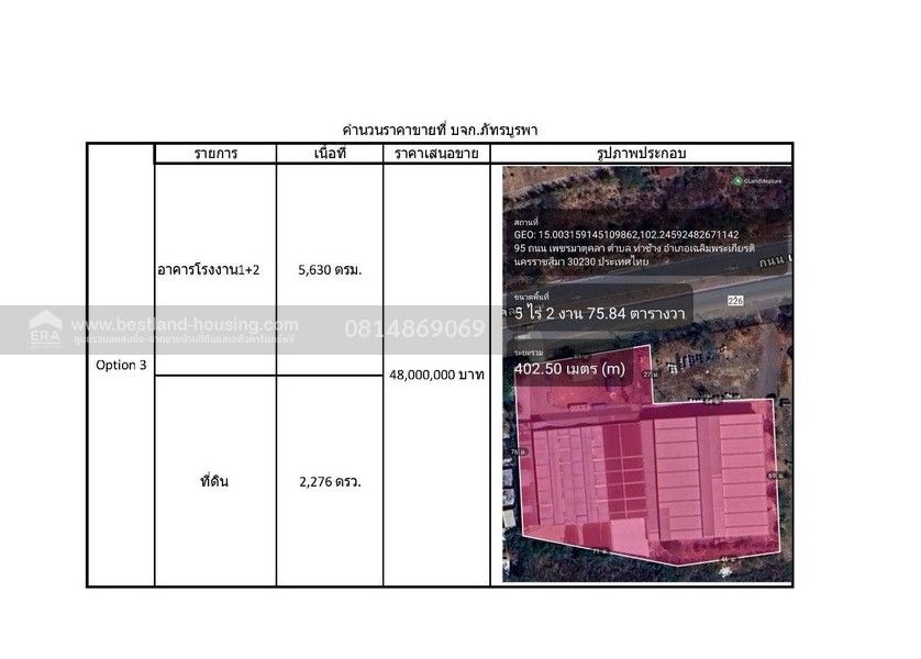 3.เนื้อที่ 5 ไร่ 2 งาน 75.84 ตร.วา พร้อม 2 โรงงาน พื้นที่ 5,630 ตร.เมตร ราคา 48,000,000 บาท(สี่สิบแปดล้านบาทถ้วน)