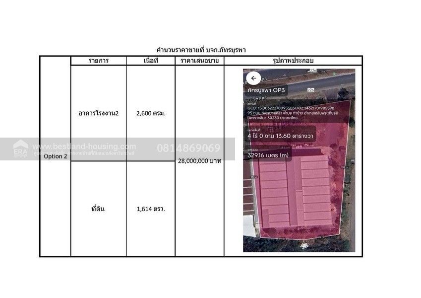 2. เนื้อที่ 4 ไร่ 13.60 ตร.วา พร้อม 1 โรงงาน พื้นที่ 2,600 ตร.เมตร ปัจจุบันว่าง ราคา 28,000,000 บาท(ยี่สิบแปดล้านบาทถ้วน)