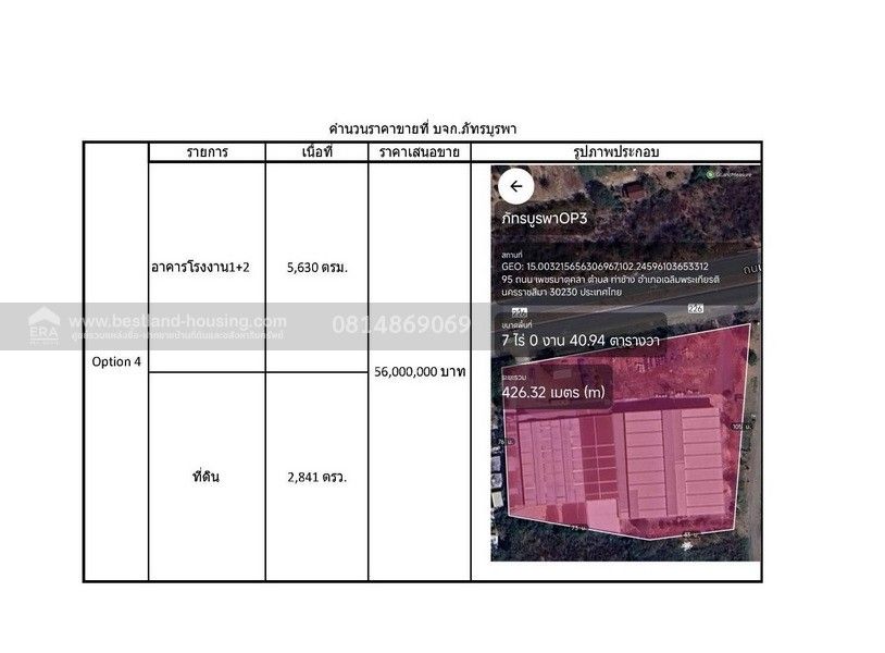 4. เนื้อที่ 7 ไร่ 40.94 ตร.วา พร้อม 2 โรงงาน พื้นที่ 5,630 ตร.เมตร 56,000,000 บาท (ห้าสิบหกล้านบาทถ้วน)