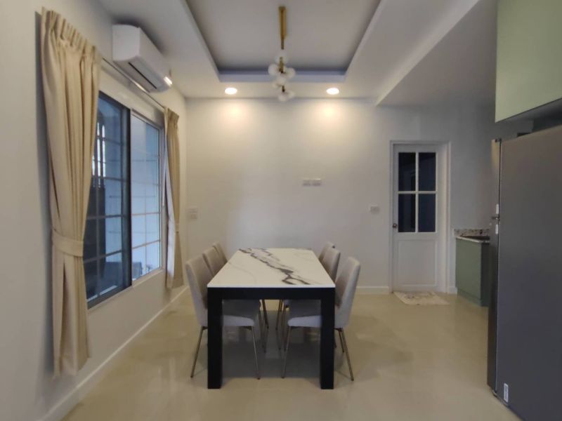 ส่วนทานอาหารมีโต๊ะอาหารหินอ่อนสำหรับ 6 ที่นั่ง , ชุดครัวบิวท์อินในบ้านพร้อมอุปกรณ์เครื่องใช้ไฟฟ้าได้แก่ เตาไฟฟ้า ที่ดูดควัน อ่างล้างจาน เตาอบแบบฝัง ไมโครเวฟ ตู้เย็น , สมาร์ททีวีติดผนัง