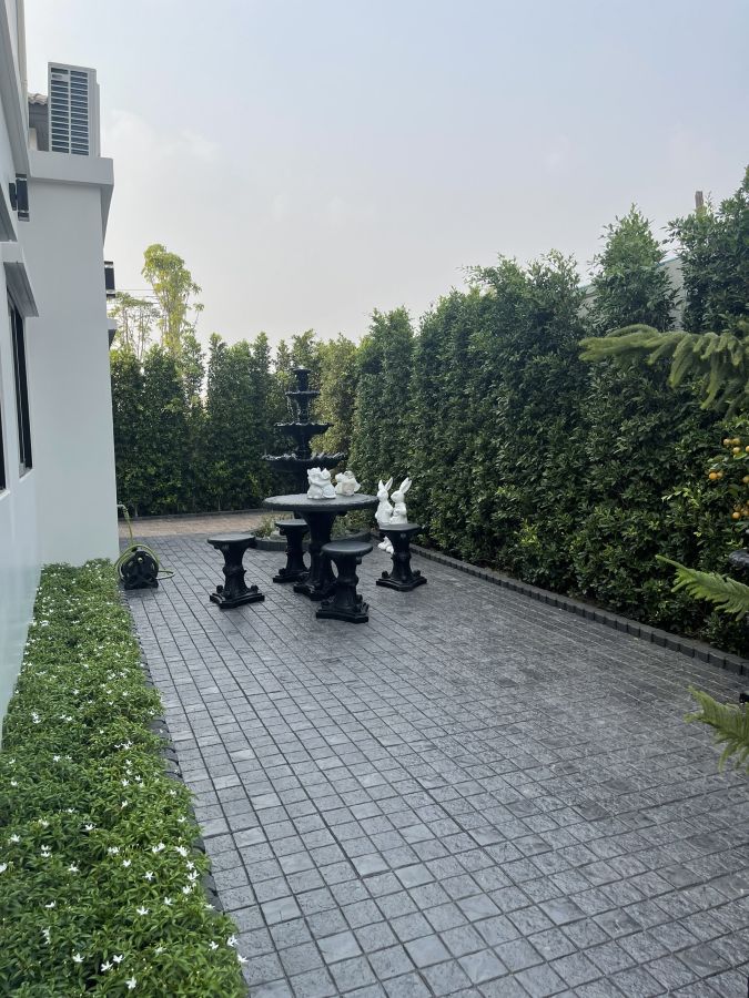 ✅ ปูพื้นรอบบ้าน มีพื้นที่นั่งเล่นส่วนตัว พร้อมน้ำพุกับวิวบ้านบรรยากาศสไตล์อังกฤษ