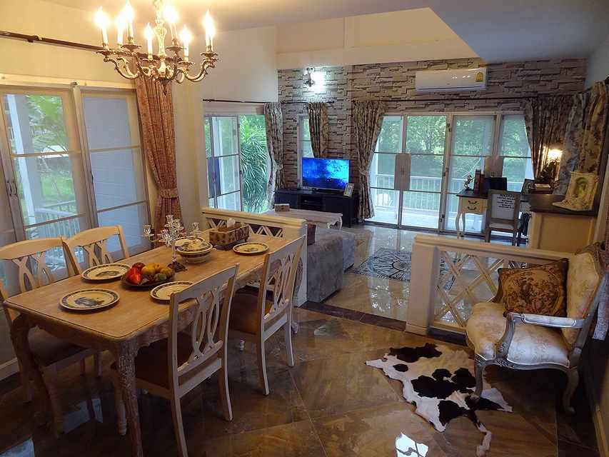 #H669 ให้เช่าบ้านพักตากอากาศ 2 ชั้น สไตล์รีสอร์ท Brookside Valley Resort ระยอง ทั้งหลัง TV LED จอ42'เครื่องเล่น DVD เคเบิ้ล ตู้เย็น ไมโครเวฟ ตกแต่งสไตล์แอนทีคผสานวีนเทจผสมความหรูหราได้อย่างลงตัว เฟอร์ไม้สักแท้ครบชุด เครื่องใช้ไฟฟ้าครบชิ้น ตัวบ้านออกแบบสไตล์ยุโรป โปร่งโล่ง
