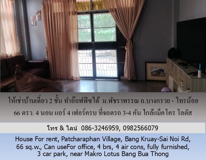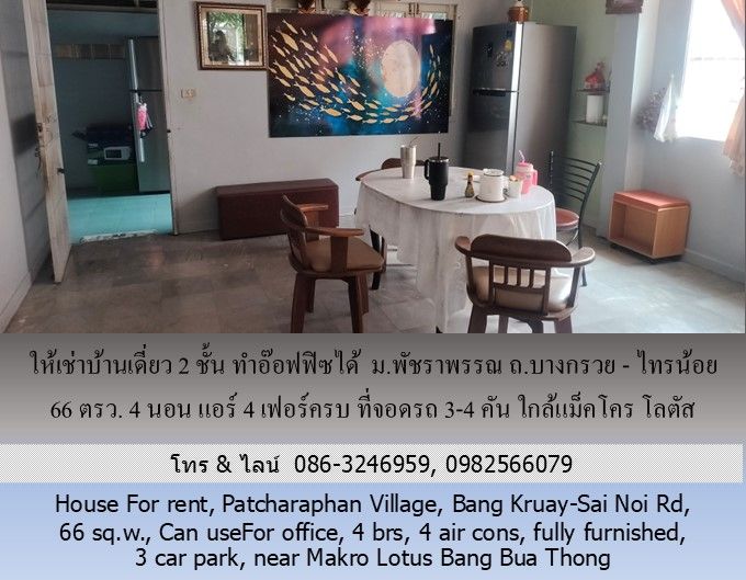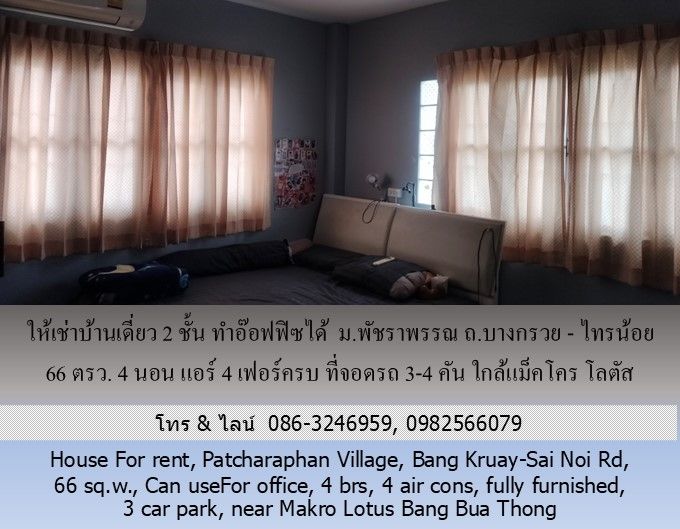 House For rent, Patcharaphan Village, Bang Kruay-Sai Noi Rd, 66 sq.w., For office, 4 brs, 4 air cons, fully furnished,3 car park, near Makro Lotus Bang Bua Thong