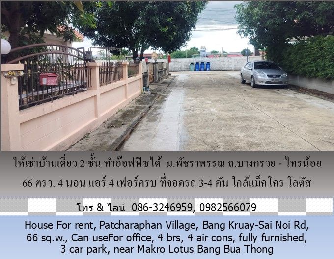 ให้เช่าบ้านเดี่ยว 2 ชั้น ม.พัชราพรรณ ถ.บางกรวย - ไทรน้อย 66 ตรว.ทำอ๊อฟฟิซได้ 4 นอน แอร์ 4 เฟอร์ครบ ที่จอดรถ 3-4 คัน ใกล้แม็คโคร โลตัส บางบัวทอง