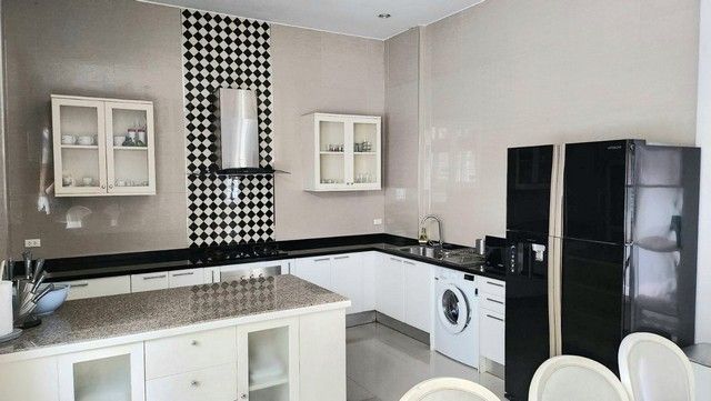 ชุดเคาเตอร์ครัว L Shape ขนาดใหญ่อย่างดี มูลค่า 3แสนบาท ตกแต่งด้วยผนังกระเบื้องทั้งโซนเพื่อการรักษาความสะอาด พร้อมเตาแก๊ส เครื่องดูดควัน เตาอบ