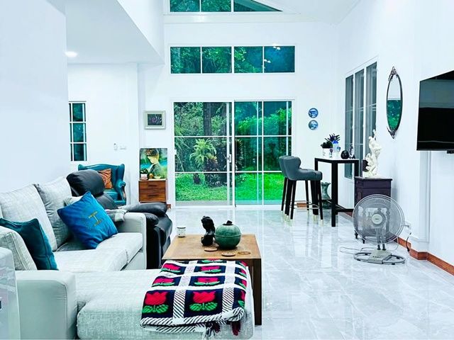 Luxury resort house for rent PlaengYao Chachoengsao Wat Hua Samrong School 1.6 km. with a small garden area of 302 sq.wa. 902 sq.m. Hua Samrong Health Promoting Hospital 2.2 km. Fully furnished 2 bed 3 bath 15,999 B-M. Hua Samrong Municipality Market 1.6 km. Shady and quiet surrounded by mature trees ideal for living or an Air BNB. Wat Kut Chi