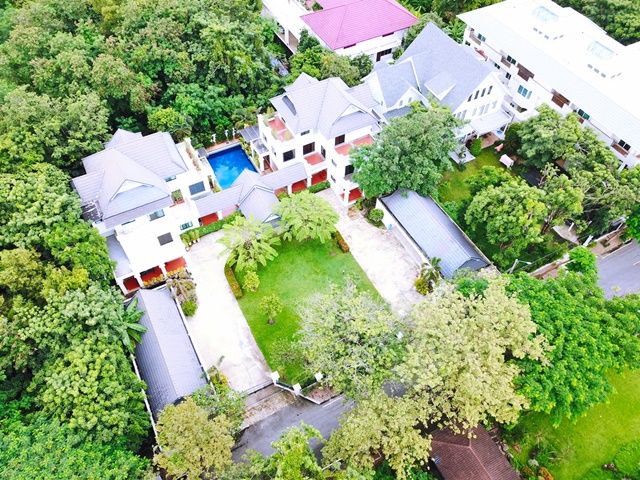 Ramintra 18-hole golf course Praserthmanukit Road NIDA. Soi SeriThai 51-61 Chocolate Ville 2.1km. 4bed3-story pool villa for rent 200sq.wah (1,200 sq.m) 64,999baht per month. 3bath with jacuzzi.