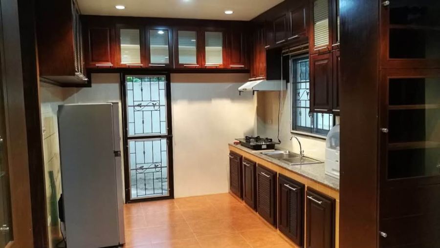 ห้องครัว เตาแก๊ส ตู้เย็น 8 คิว ห้องรับประทานอาหาร พร้อมโต๊ะและเก้าอี้ 6 ตัว แอร์ 18000 BTU