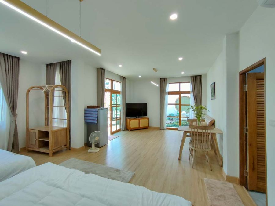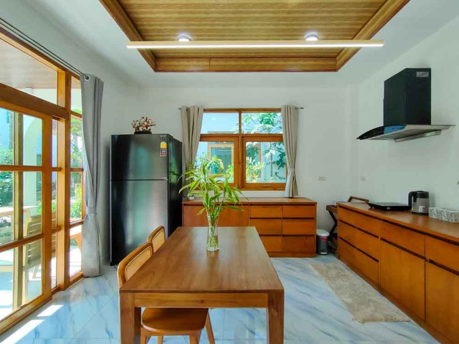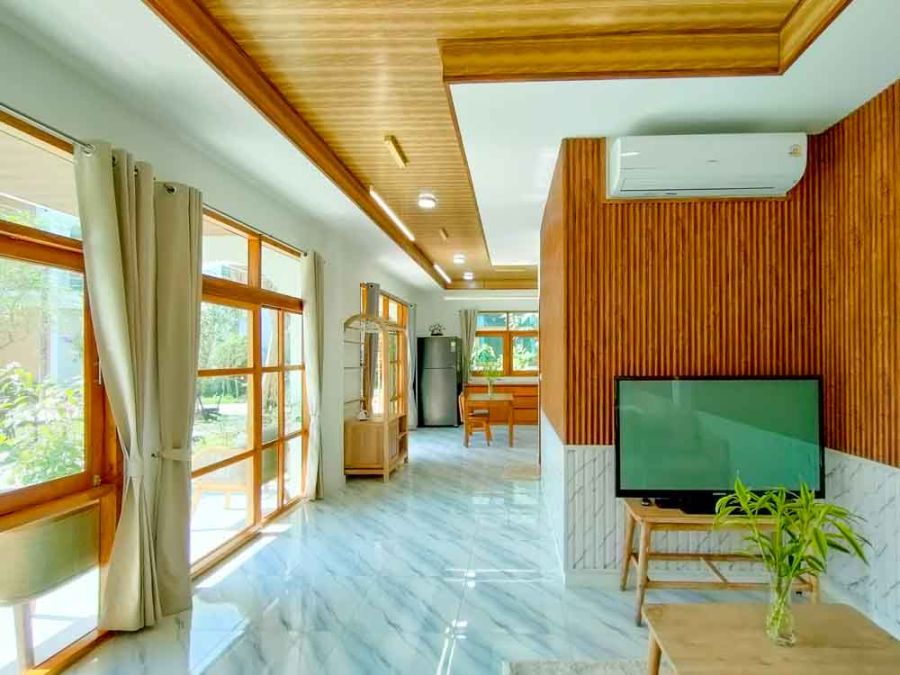 🏡 This villa features a cozy living area equipped with a TV and a comfortable sofa set, perfect for relaxing. It also includes a dining room for shared meals and a modern Western-style kitchen, complete with all necessary appliances and equipment for cooking. The layout offers a practical yet elegant space for living and entertaining.