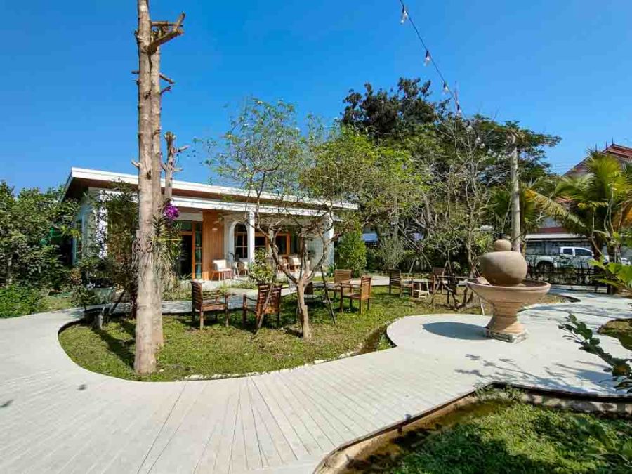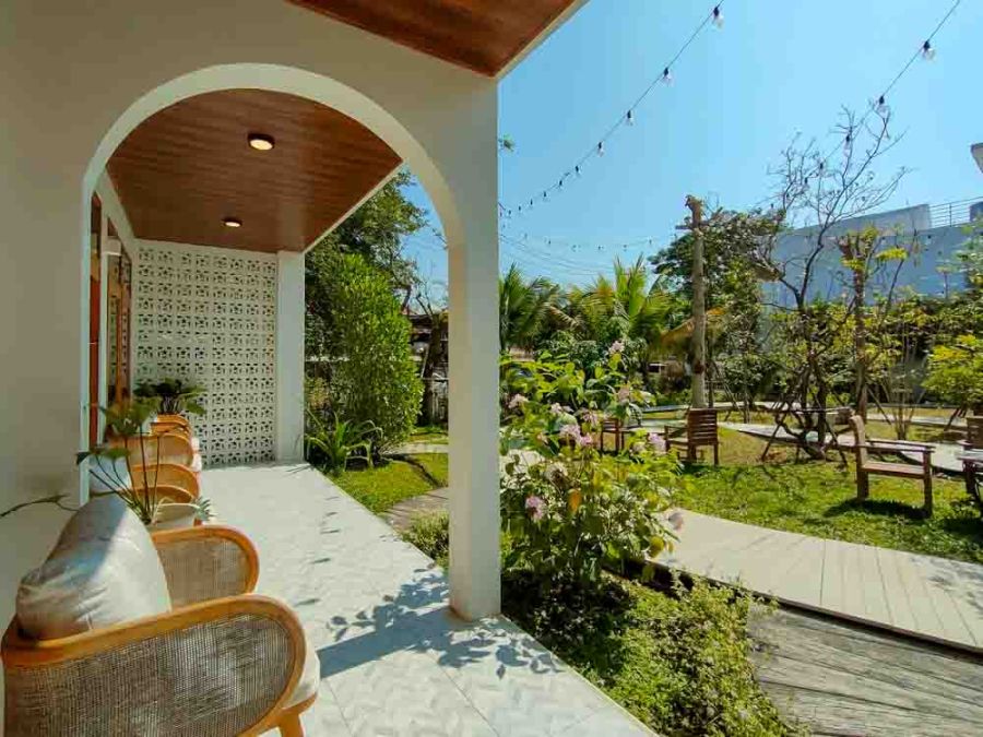 สวนเขียวชอุ่มและที่นั่งกลางแจ้งสร้างบรรยากาศที่ร่มรื่นสบาย