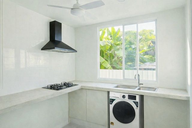 ห้องครัวรับแสงธรรมชาติ อากาศถ่ายเทดี พร้อมฮู้ด และหน้าต่างบานใหญ่